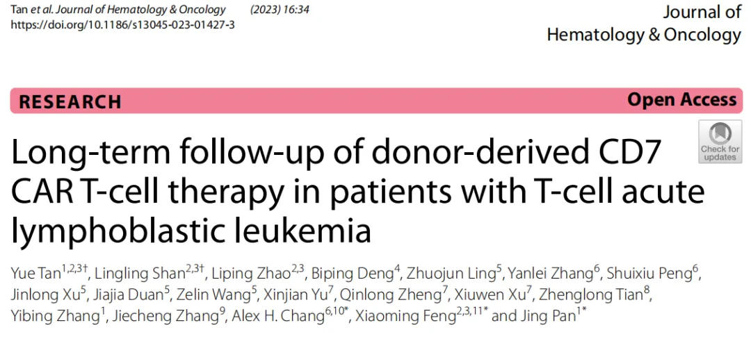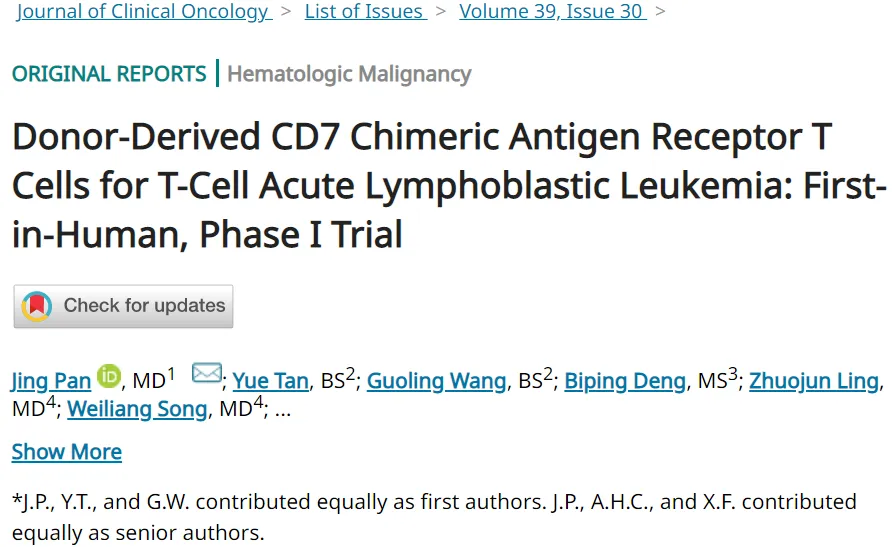 2023-4-52021年7月,由高博医学(血液病)北京研究中心北京高博博仁医院潘静主任团队、中国医学科学院血液病医院(中国医学科学院血液学研究所)冯晓明教授团队、同济大学医学院张鸿声教授团队等机构共同完成的“Donor-Derived CD7 Chimeric Antigen Receptor T Cells for T-Cell Acute Lymphoblastic Leukemia: First-in-Human, Phase I Trial”研究在线发表于Journal of Clinical Oncology(IF=45)(图1)。